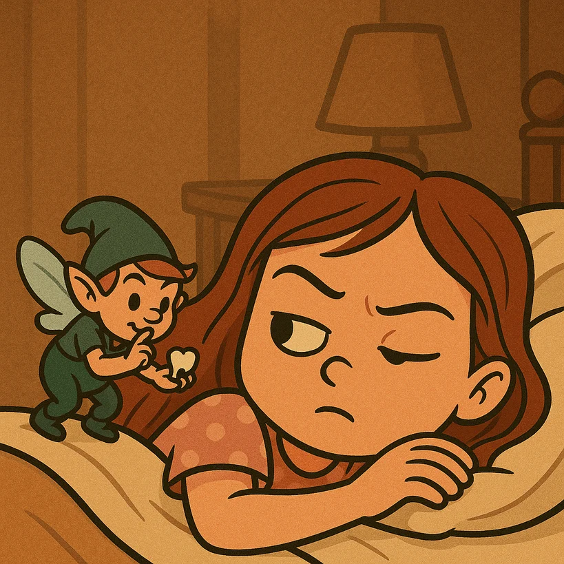 Molly feels a tug on the elastic hairband looped around her wrist. She slips the hand slowly under the pillow. The pulling becomes frantic. A final yank pulls her arm out fully. Molly opens her eyes. Standing in front of her, on the edge of the bed—and sweating profusely—is the small creature dressed in a dark uniform, staring right at her. It pauses, holding the tooth in its hands. Dental floss is glued to the tooth and pulled taut against Molly’s wrist. Small beady eyes widen in alarm. The creature drops off the side of the bed, just as she reaches for it. Her hand strikes the bedside lamp, knocking it to the floor. The bulb flashes before breaking.